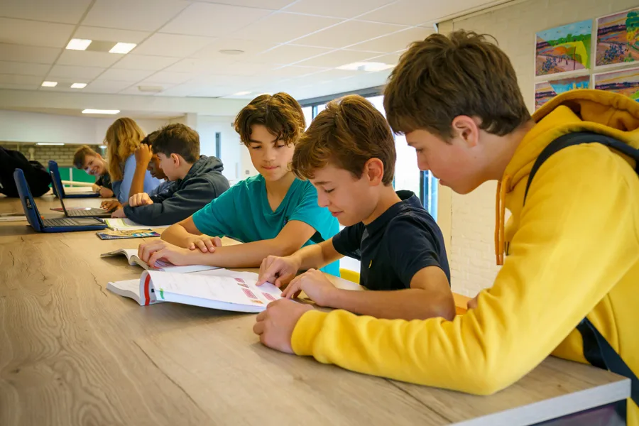In het hart van de school, naast onze studieruimte, bevindt zich de bibliotheek. Een rustige plek waar leerlingen boeken kunnen lenen en in stilte kunnen werken of lezen.