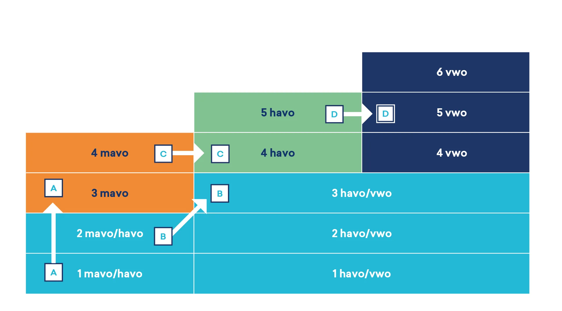 De mavo/havo-brugklas duurt twee jaar. Stroom je daarna door naar de mavo, dan ga je verder in leerjaar 3 en doe je eindexamen in leerjaar 4. Kies je voor de havo, dan ga je door naar leerjaar 3 havo/vwo.